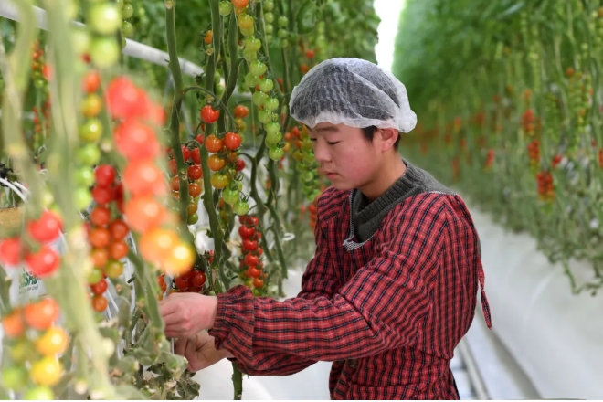 在古浪縣黃花灘生態(tài)移民區(qū)富民新村現代化智能玻璃溫室,村民在管護番茄 范培珅 攝