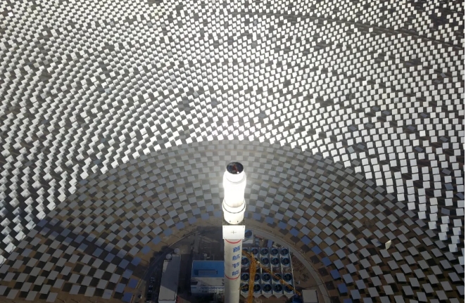 人們驚呼,這是自然力與人類智慧的完美創(chuàng)造:戈壁荒灘上“種”出了人造太陽。這個100兆瓦熔鹽塔式光熱電站,占地面積相當于780個足球場,每年所生產的綠電可減排35萬噸二氧化碳。