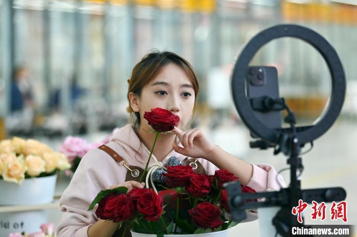 11月20日,在甘肅省臨夏回族自治州臨夏市百益億農(nóng)國(guó)際鮮花港內(nèi),工作人員進(jìn)行網(wǎng)絡(luò)直播售賣鮮切玫瑰。九美旦增 攝