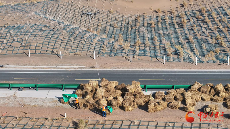 金塔縣自然資源局林業(yè)工程師李永華說:“今年,治沙工程逐步向沙漠腹地延伸,施工難度也在不斷增大,今年施工單位采用了無人機(jī)吊運(yùn)和沙地摩托運(yùn)送原材料,克服施工困難,在施工方法上,除了采用人工施工,今年從外地引進(jìn)了幾臺機(jī)械化草方格壓沙的機(jī)械,加快了施工進(jìn)度。”