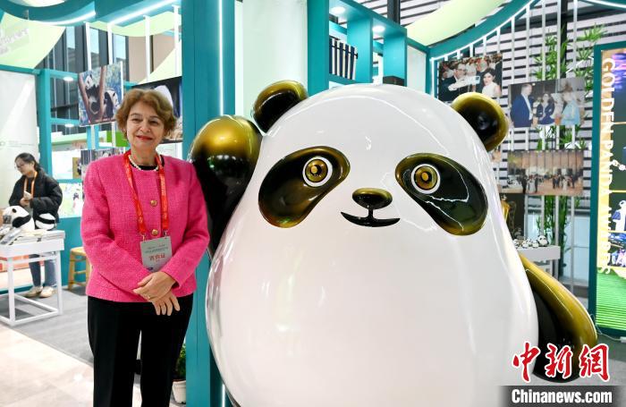 11月26日,四川成都,聯(lián)合國教科文組織前總干事、歐盟亞洲中心董事會高級顧問伊琳娜·博科娃與大熊貓玩偶合影留念。中新社記者 安源 攝