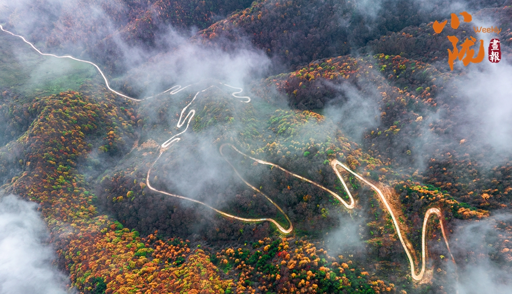 山巒起伏,彩林密集,鋪滿(mǎn)整座山谷。山巔公路宛若玉帶鋪成開(kāi)來(lái),橫貫蒼茫的林海之上,直通天際。