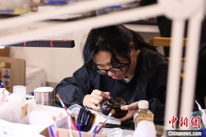 11月27日,南昌漢代?;韬顕z址博物館的漆器修復(fù)室內(nèi),文物修復(fù)師正在修復(fù)一件漆器?!⑺紓?nbsp;攝