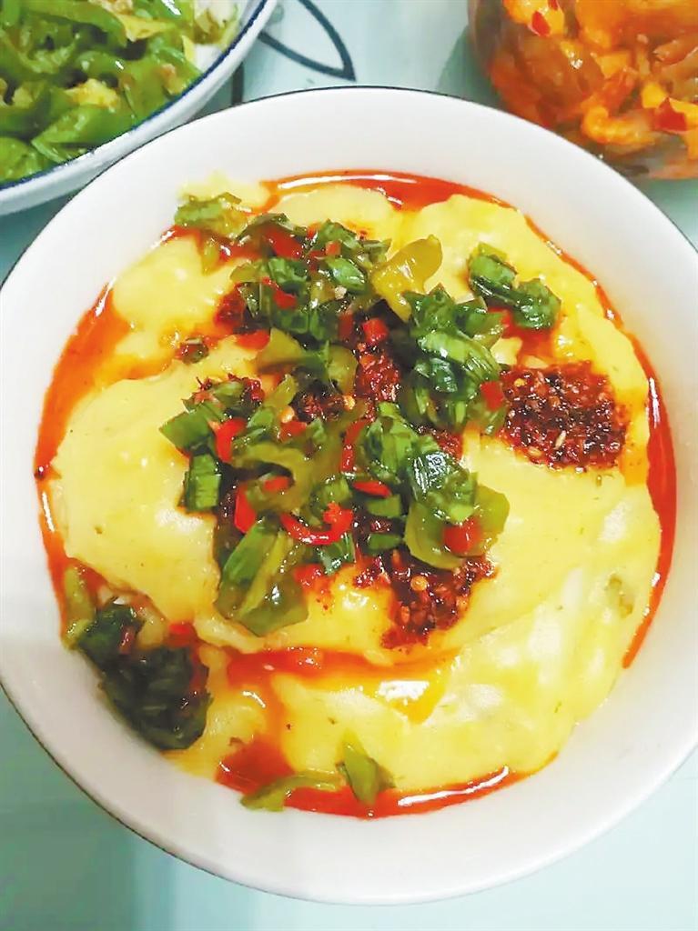 我們一人一碗,端著吃,兩三口馓飯,一筷酸菜。有段時間,我喜歡馓飯里倒醋吃,也酸,撒點鹽,再來點辣椒油,就香了。剛開始覺得是創(chuàng)新,很得意,母親批評了幾次,遂作罷了。吃馓飯,有講究,左手端碗,碗要不停旋轉,要不燙手,端不住,邊轉邊用筷子夾,夾一口,吹一下,方可進嘴,要不燒嘴。馓飯,我們也叫“燒心飯”,夾不好,吹不涼,一口下肚,如火炭,直墜心窩,燒得人幾欲斷氣。當然,也不至于如此可怕。只要不囫圇吞棗。一筷馓飯,入口進肚,頓覺熱氣穿腸而過,渾身溫暖,舒服之意自不必言說。