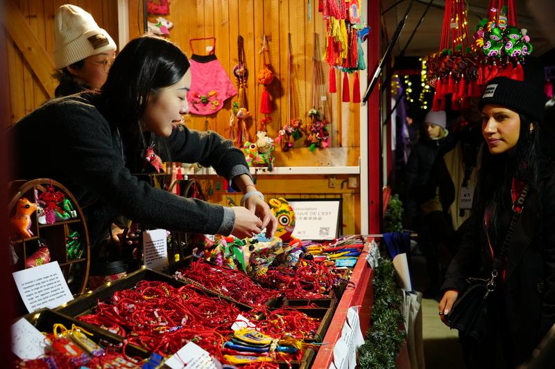 (法國(guó)巴黎圣誕集市慶陽(yáng)香包展位前,志愿者正在為外國(guó)友人熱心介紹不同香包的寓意與功能。)