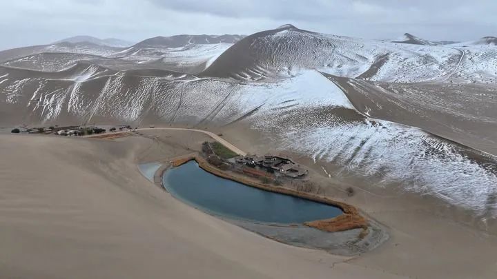 這是2014年11月23日拍攝的敦煌市鳴沙山月牙泉景區(qū)雪景(無(wú)人機(jī)照片)。新華社發(fā)(張曉亮攝)