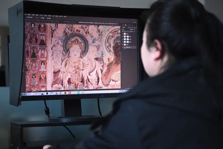 2023年4月25日,敦煌研究院文物數(shù)字化保護(hù)團(tuán)隊(duì)圖像處理人員年海麗在拼接壁畫(huà)圖像。新華社記者 陳斌 攝