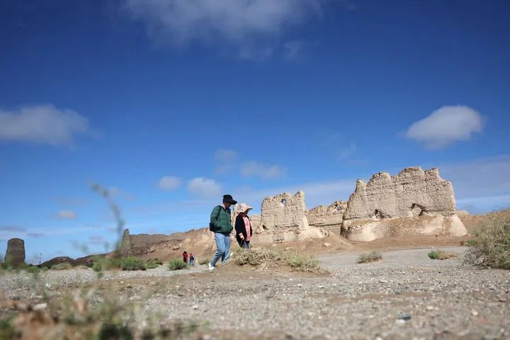 2024年9月4日,游客在雨后的玉門(mén)關(guān)遺址區(qū)大方盤(pán)城游覽。新華社記者 陳斌 攝