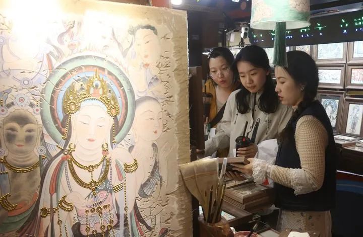 街道上,獨(dú)具特色的文化元素?zé)o處不在。民宿老板用改良的“三兔共耳”紋樣裝飾門(mén)楣,茶館的八棱柱竟是莫高窟中心塔柱的微縮版。最多的還是書(shū)店和文創(chuàng)店,一家挨著一家,紅柳根雕、敦煌樂(lè)器、創(chuàng)意工美、飛天泥版畫(huà)琳瑯滿目。