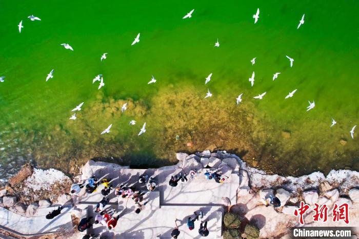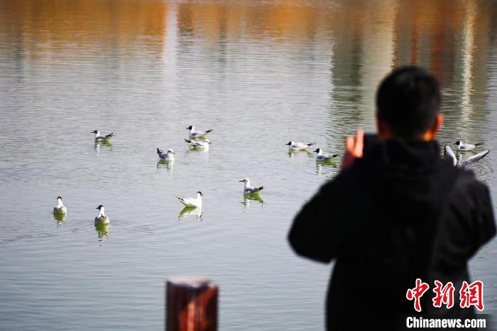 紅嘴鷗現(xiàn)身銀川燕鴿湖畔,吸引市民游客駐足觀賞。馬楠 攝