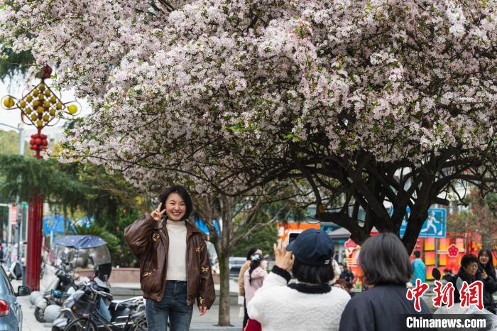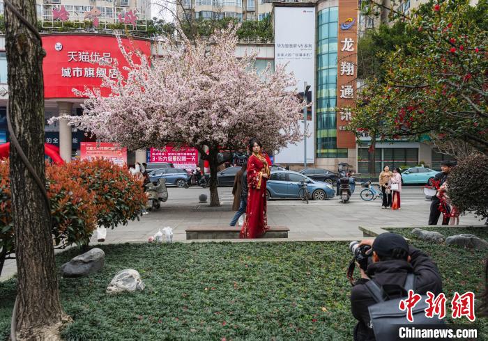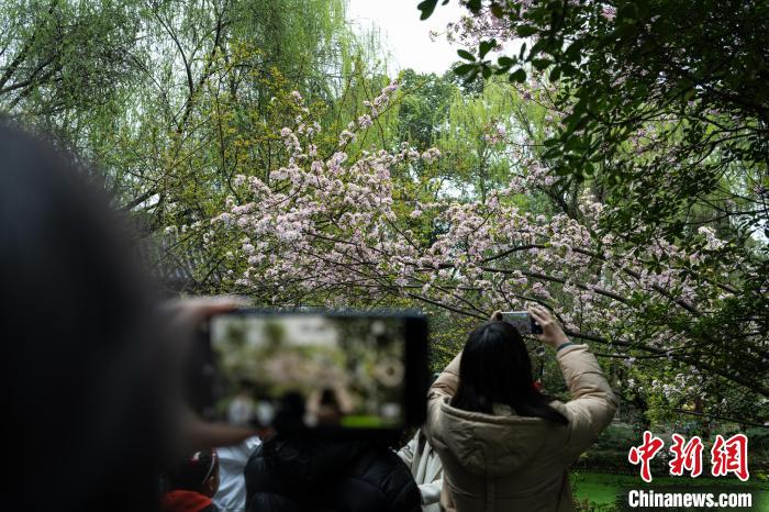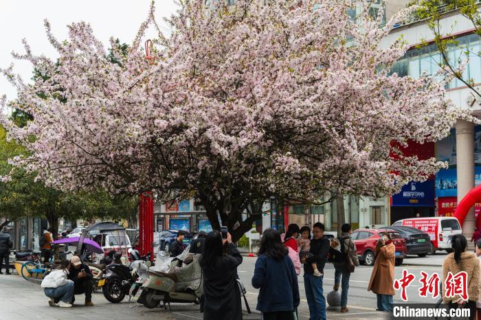 圖為3月16日,棠湖公園正大門(mén)處,垂絲海棠盛開(kāi),市民在此拍攝寫(xiě)真照。韓金雨 攝