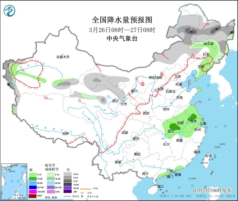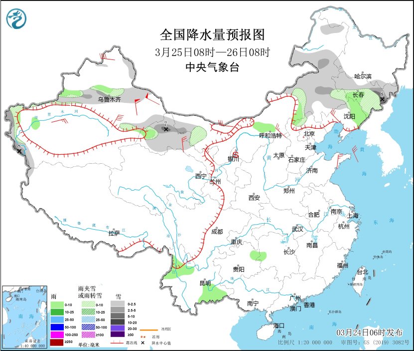 3月25日08時(shí)至26日08時(shí),新疆沿天山地區(qū)、內(nèi)蒙古西北部和東部、吉林大部、甘肅河西等地部分地區(qū)有小到中雪或雨夾雪,其中,吉林東部、新疆南疆西部山區(qū)、甘肅北部等地部分地區(qū)有大雪(5~8毫米)。新疆伊犁河谷、內(nèi)蒙古中部、吉林中部、遼寧東部、河北北部、湖南西部、貴州東北部、云南西北部和東南部等地部分地區(qū)有小雨。內(nèi)蒙古中西部、遼寧西部、山東半島、新疆東部、甘肅北部等地部分地區(qū)有4~6級風(fēng),新疆山口地區(qū)陣風(fēng)風(fēng)力8~9級。內(nèi)蒙古中西部、甘肅河西、寧夏等地部分地區(qū)有揚(yáng)沙。