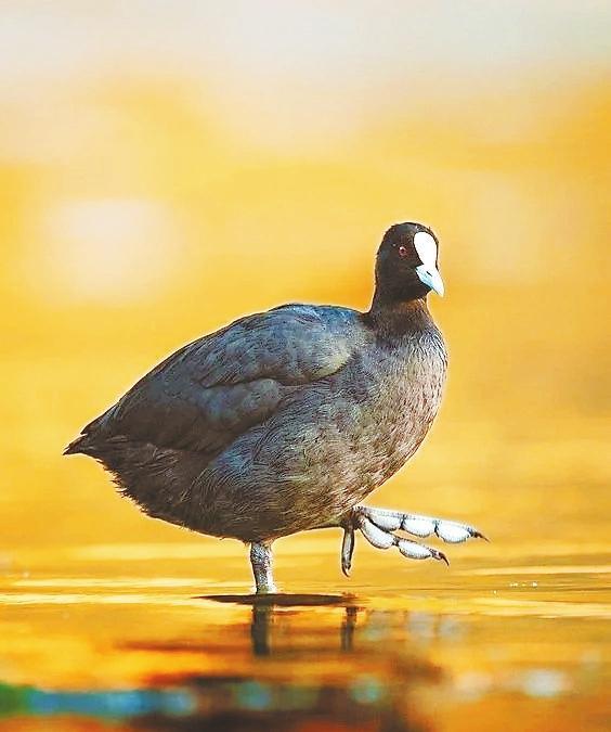 白骨頂又被喚作骨頂雞,卻是鶴類的遠(yuǎn)親。它靜浮水面時,額前一抹象牙白,宛若遺落人間的墨玉鎮(zhèn)紙。這枚額甲實(shí)為特化的角質(zhì)層,是為了保護(hù)頭部的盔胄。灰白色的瓣蹼如雪地靴般包裹趾間,劃開水藻時泛起粼粼波光——這身黑羽配雪蹼的穿搭,竟比時裝周的極簡主義更先鋒。當(dāng)它們列隊掠過蘆葦蕩,水淼勾勒的剪影里,仿佛在繪制著秋天的信箋。