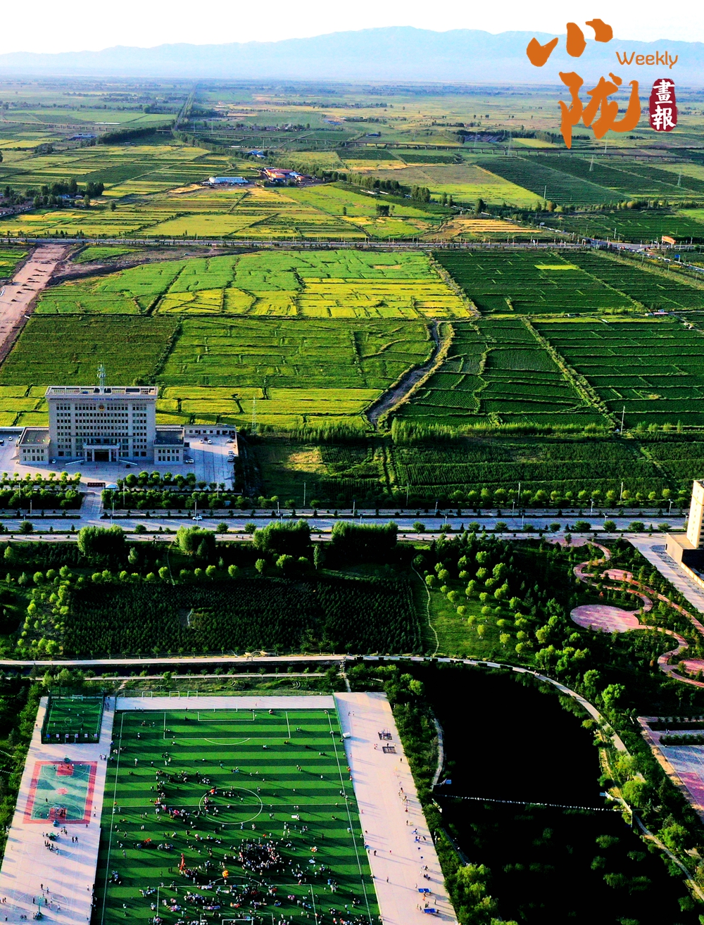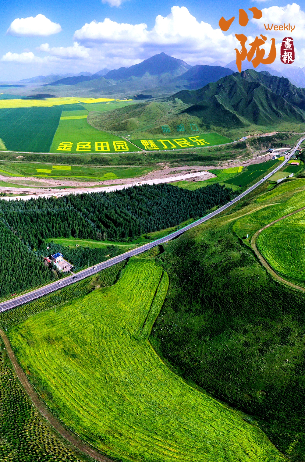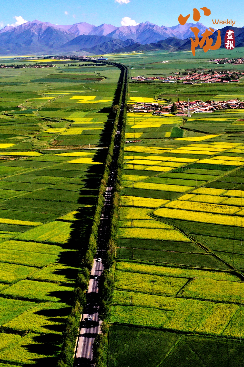 廣袤無邊的田野生機(jī)盎然,金黃色的油菜花夾雜著一塊塊碧綠色的麥田,好像給大地鋪上了一層五顏六色的大地毯。漂亮的民居鑲嵌其中,與祁連山相互輝映,在陽光下美麗極了!