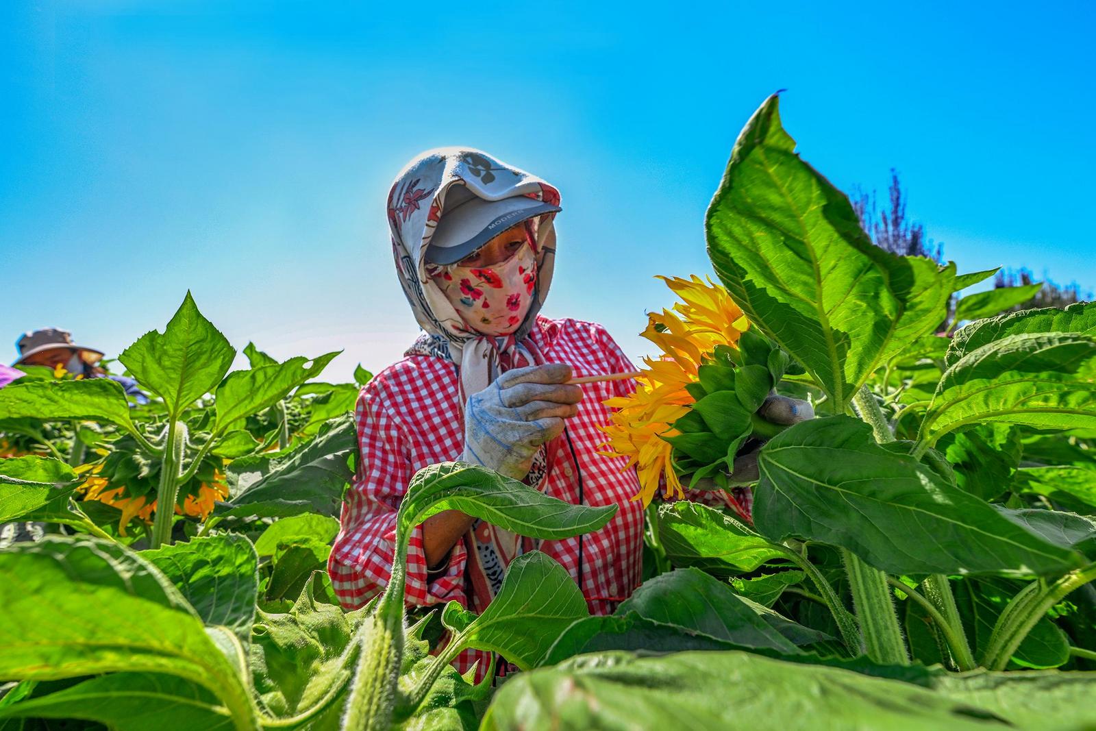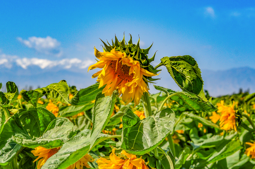 中國(guó)甘肅網(wǎng)7月14日訊 據(jù)嘉峪關(guān)日?qǐng)?bào)報(bào)道(融媒體中心記者 李巍 攝)近日,嘉峪關(guān)市新城鎮(zhèn)野麻灣村“千畝”制種向日葵迎來盛花期,朵朵花盤匯聚成金色花海,放眼望去,與雪山相融、與藍(lán)天相接,如詩(shī)如畫,美不勝收。
