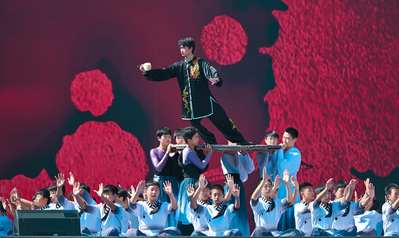 活動(dòng)伊始,開(kāi)場(chǎng)片《歡迎乘坐崆峒號(hào)》以“環(huán)西部火車(chē)游·崆峒號(hào)”平?jīng)雎糜螌A袨殪`感,通過(guò)跨時(shí)空對(duì)話串聯(lián)崆峒山古今脈絡(luò),拉開(kāi)活動(dòng)序幕?,F(xiàn)場(chǎng),街舞與崆峒武術(shù)團(tuán)體合作的《武韻崆峒》展現(xiàn)武術(shù)與現(xiàn)代肢體藝術(shù)新生機(jī);笛子演奏與武術(shù)冠軍聯(lián)袂呈現(xiàn)的《崆音劍影》打造“可聽(tīng)的武術(shù)”沉浸式體驗(yàn);30人陣容的江蘇武協(xié)女子太極拳團(tuán)體演繹《鶴起崆峒》,詮釋武術(shù)新功用;國(guó)風(fēng)歌手與秦腔表演藝術(shù)家合作的《秦韻長(zhǎng)歌》,展現(xiàn)“武戲同源”的多元魅力。