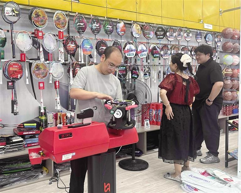 不僅如此,運(yùn)動(dòng)用品銷售也迎來(lái)小高峰。瑞德摩爾太平洋商場(chǎng)內(nèi)的健雄體育用品店內(nèi),老板正忙著給羽毛球空拍穿線。“我們不僅有現(xiàn)成的羽毛球拍,還可以根據(jù)客戶的需求給空拍穿線。”該店老板介紹,羽毛球拍網(wǎng)線價(jià)位30至100元不等,購(gòu)線還可免手工費(fèi)。羽毛球初學(xué)者一般都會(huì)買(mǎi)成品拍自己在家練習(xí),而一些技術(shù)較好的顧客除了會(huì)選擇品質(zhì)較好的空拍,還會(huì)現(xiàn)場(chǎng)選線拉網(wǎng)定制屬于自己的球拍。“暑假以來(lái),店內(nèi)羽毛球拍銷量大增,穿線需求也逐漸增多,周末從早忙到晚,每半小時(shí)穿一個(gè)球拍,最多一天穿24個(gè),排隊(duì)等候已成常態(tài)。”此外,不少運(yùn)動(dòng)品牌也順勢(shì)推出促銷活動(dòng),吸引消費(fèi)者選購(gòu)。