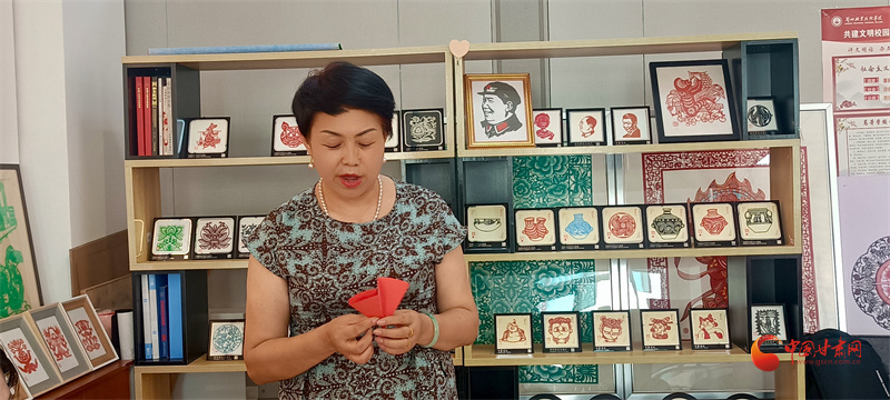 蘭州職業(yè)技術(shù)學(xué)院非物質(zhì)文化遺產(chǎn)學(xué)院剪紙工作室,史婷老師正在教同學(xué)們剪紙。“咔嚓、咔嚓……”的剪紙聲如美妙的音符,那樣熟悉,又那樣動(dòng)聽。