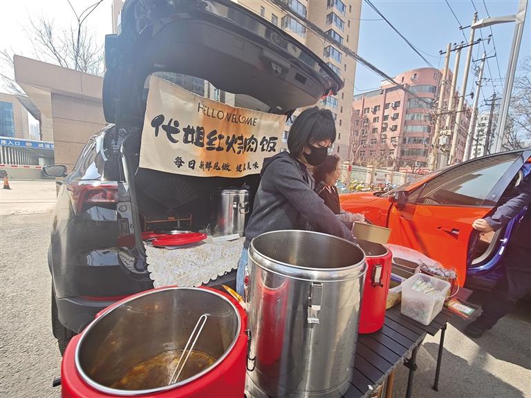 上午11時20分,甘南路民族飯店門口的人行道上,一輛簡易流動餐車準(zhǔn)時支起攤位。不銹鋼餐盆里,色澤鮮亮的炒肉片蓋飯熱氣升騰,濃郁香氣順著風(fēng)飄向周邊寫字樓,短短幾分鐘,攤位前就排起了七八人的小長隊(duì)。“老板,一份炒肉片蓋飯,多放青椒和咸菜!”“我要兩份,打包帶走!”熟練打飯、快速裝盒、掃碼收款,一氣呵成,不到20分鐘,桶里的米飯就下去了小半桶。