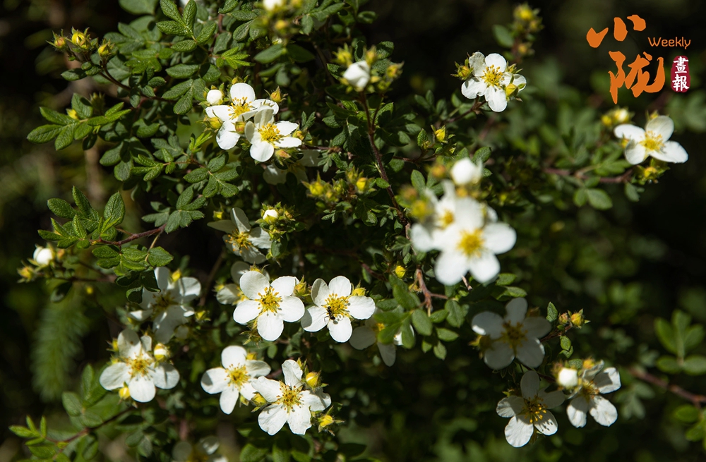 銀露梅,屬于薔薇科委陵菜屬落葉灌木。它多生長(zhǎng)在高海拔的山坡、巖石縫中,葉片羽狀分裂,邊緣帶鋸齒,白色小花簇?fù)黹_(kāi)放,花蕊明黃,花期在5-7月,耐寒耐旱,是頗具觀賞價(jià)值的野生植物。