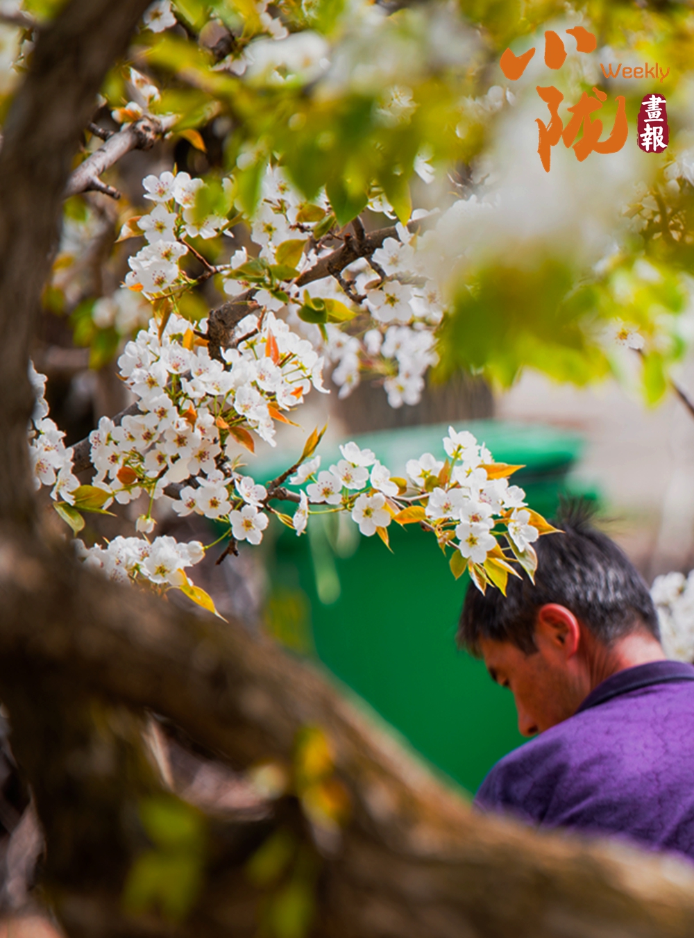 簇簇白梨花在枝頭盛放,嫩黃新葉點綴其間,背景里勞作的身影,讓這臨洮春景多了幾分煙火氣息。